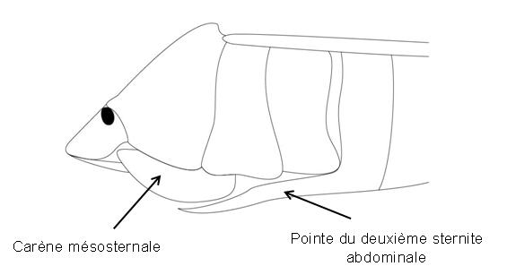 Gli Acantosomatidae hanno, oltre ai due articoli tarsali ed un aspetto più allungato, una carena mesosternale e addominale o un processo appuntito che sale dal secondo sternite addominale come illustrato in questa immagine tratta da qui
