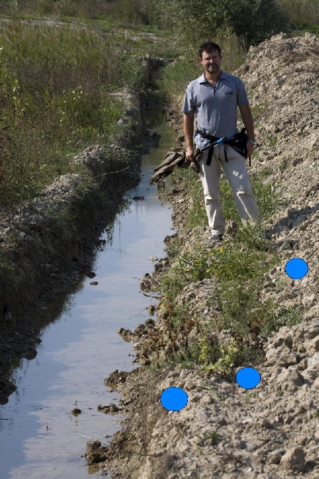 Orbene, non considerando il "notevole" esemplare di entomologo immortalato :p , si può intravvedere l'ambiente di raccolta, dove abbiamo incontrato ed in parte raccolto una notevole quantità di Mutillidi (tutte femmine). Con dei cerchietti blu ti ho indicato esattamente i luoghi maggiormente frequentati, ovvero: le pareti verticali del piccolo canale, il piano subito a ridosso e il leggero pendio dove si trova la terra rimossa (presumo) per lo scavo del canale.