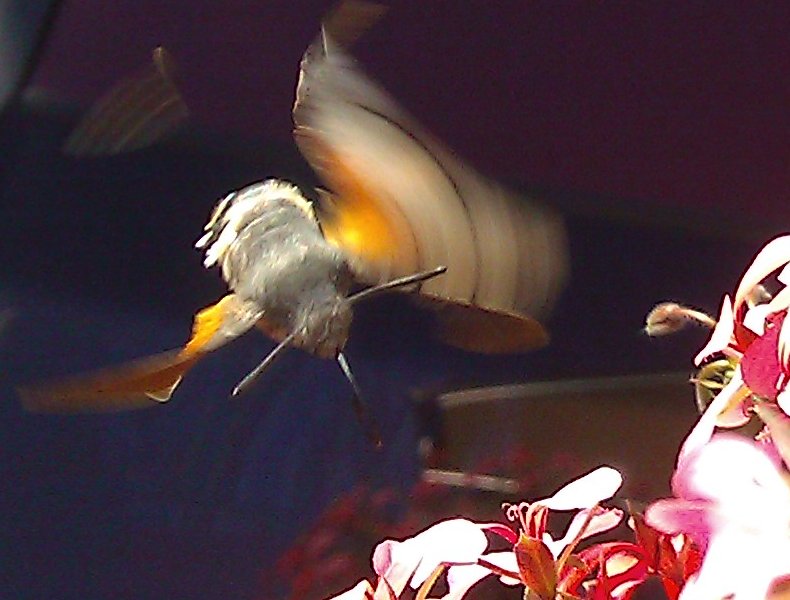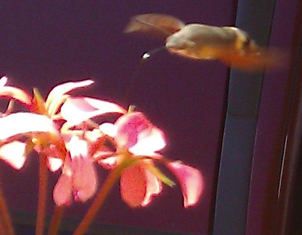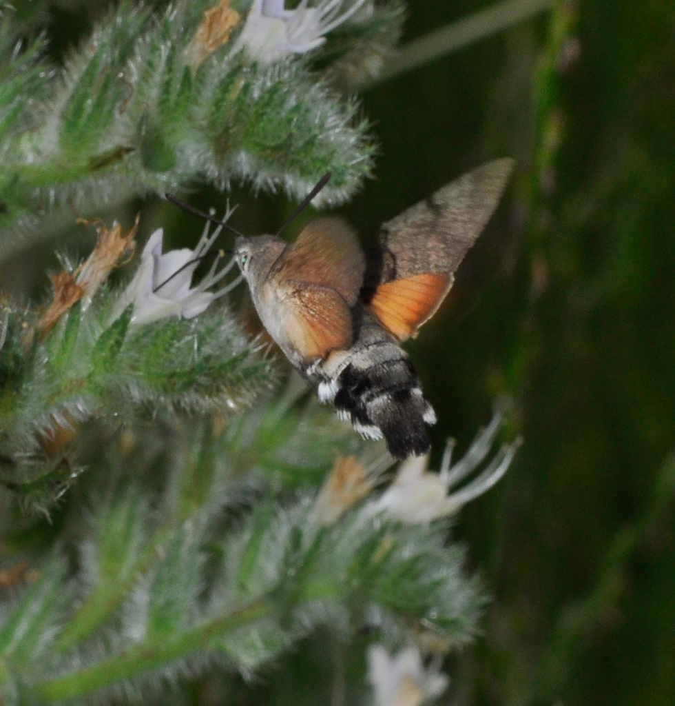 Polygonia ha scritto: quest'anno ho visto più volte e in vari posti un insetto che non avevo mai visto (o notato). E' sempre solitario e succhia dai fiori senza posarsi e fermandosi per frazioni di secondo (non volendo ucciderlo, le foto sono quello che sono, ma è tanto veloce che il suo aspetto mi è molto più chiaro qui che dal vivo). Ciao Oliverio, benvenuto anche da parte mia. Allego qui una foto di un altro esemplare della stessa specie ( Macroglossum stellatarum) fotografato in Grecia. In questo momento uno ha deciso di svernare nella mia stanza, nell'angolo con il soffitto.