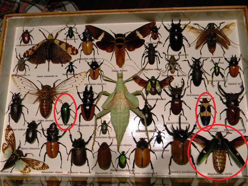 Devo dire che quelli di cui si legge il nome sembrano determinati correttamente. Quel Melolonthidae determinato come Buprestidae sp. ricorre in diverse cassette entomolgiche che ho visto tempo fa in vendita su Ebay. Evidentemente vengono tutti dallo stesso fornitore iniziale.
