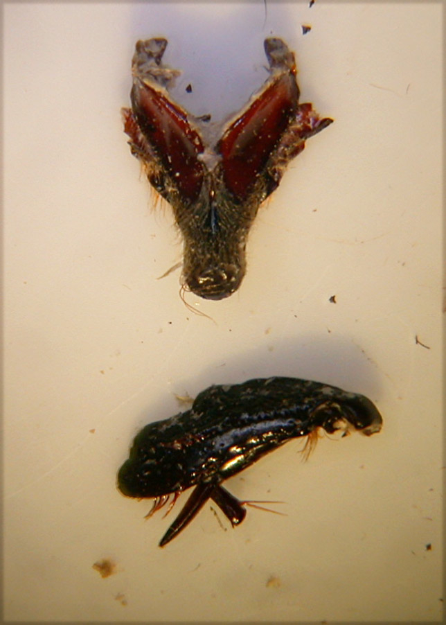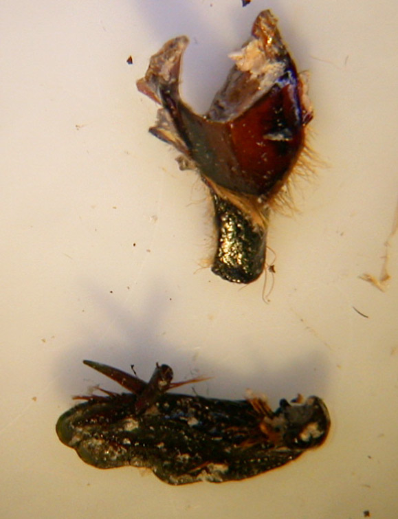 L'amico Bruno Massa mi invia oggi alcune foto di frammenti di coleotteri, non facili da identificare, presenti in borre di grillaio, raccolte in Sicilia. Ve le propongo, sperando si possa capircene qualcosa, anche solo a livello di Famiglia (ma la vedo dura). Prima foto. Elitra con punti grossi e piccole squame bianche laterali, più altri frammenti. L'elitra misura 5,2 mm. Seconda e terza foto. Frammento di zampa (5,2 mm) con un'evidente spina e una forcella che potrebbe essere una parte dello sterno (mi fa pensare ad uno Scarabeoidea) Quarta foto. Mandibola di imenottero? Dimensioni: 4,7 mm