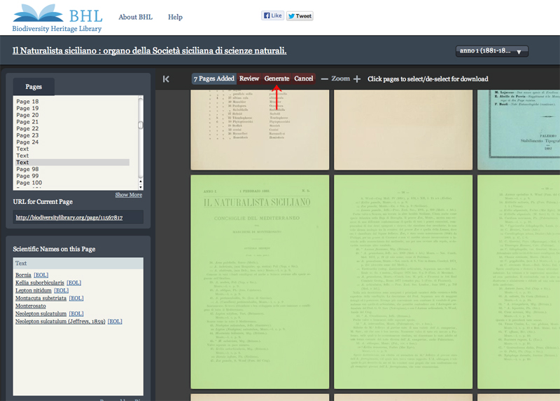 3. Seleziona, una ad una, le pagine che ti interessa scaricare (puoi farlo fino ad un massimo di cento per volta), cliccandoci sopra col tasto sinistro del mouse: quando selezioni una pagina questa diventa verde. Nel nostro esempio, selezionerai dal Volume le pagine 2-4 e 97-99 (7 pagine in totale). Quando avrai selezionato tutte le pagine che ti interessano, clicca sul pulsante "Generate" (barra in alto):