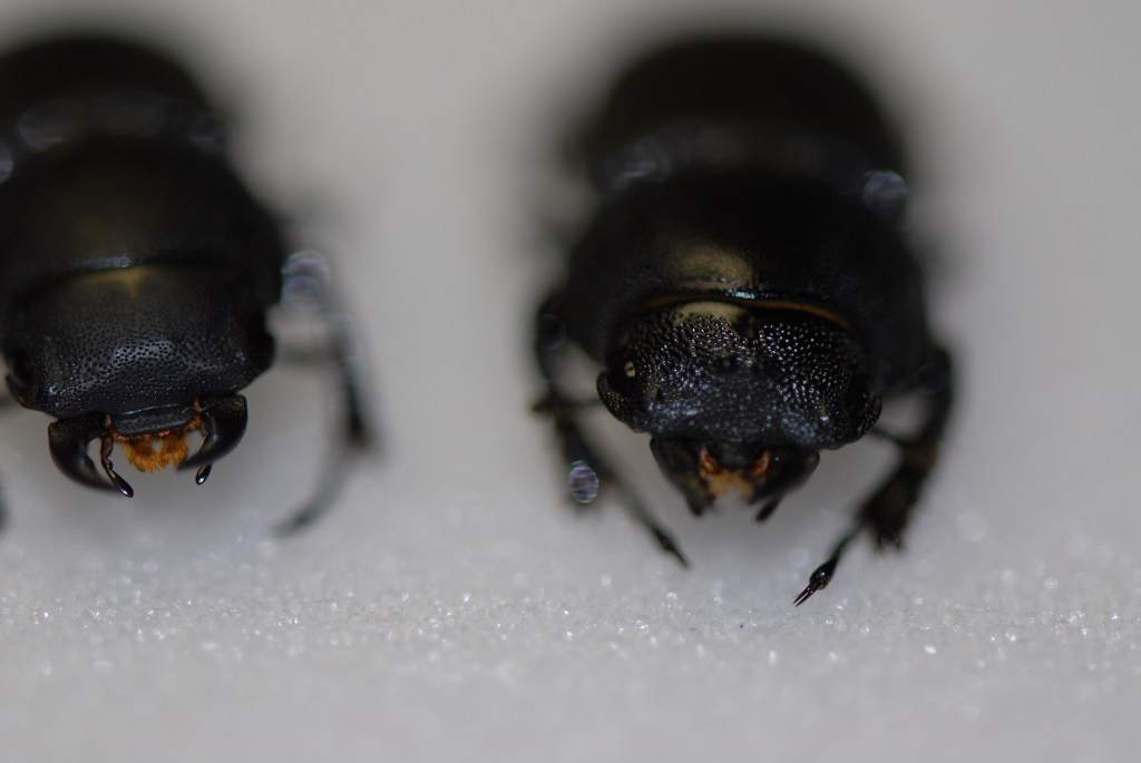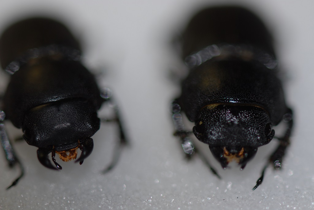 Saluti a tutti...nelle tre foto seguenti ho ritratto due Dorcus. Mi piacerebbe sapere se dalle leggere differenze che ho notato io a livello di scissura mediana tra le ultime due paia di zampe e soprattutto a livello di fronte (ammesso si chiami così), in cui ho notato nell'esemplare a destra la presenza di due piccoli tubercoli centrali, che invece mancano in quello di sinistra, si possa dire che uno è un maschio e l'altra la femmina.