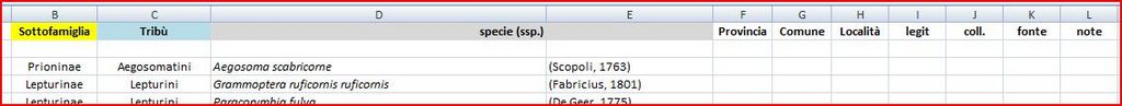 Ma esce una cosa veramente caotica, soprattutto perchè non conosco sempre tutti i dati, sicché restano fra le colonne un sacco di "buchi" e risulta difficile capire "a vista" quali dati sono riferiti a quale specie. Forse mi conviene evitare tutte quelle diverse colonne coi dati... Magari le riunisco in due sole colonne: località di raccolta e "altri dati" (legit, coll., fonte, note...). Così per la località posso riordinare i dati e vedere quali specie sono state prese dove, mentre per gli altri dati non posso farlo ...