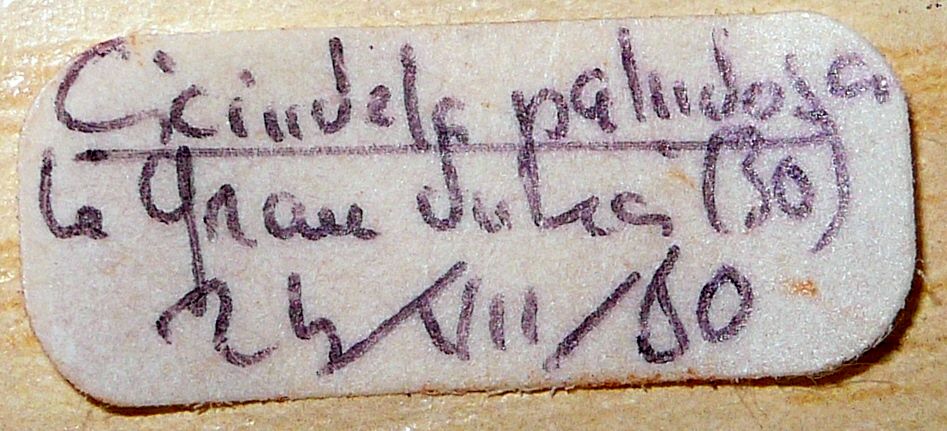 Mi è stata donata insieme ad altre cicindele una Cylindera paludosa che riporta il cartellino che vedete in foto:
