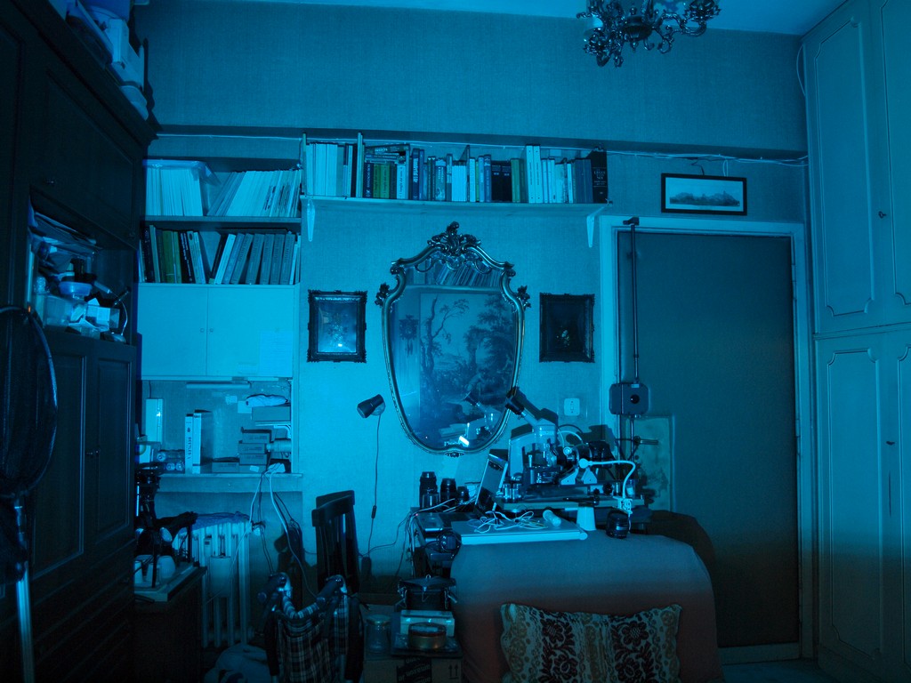 Il bilanciamento del bianco ha cercato di correggere la tonalità riducendo la dominante verde e blu, per cui tutto ciò che doveva apparire di quei colori appare invece quasi grigio. Al contrario, i rossi e colori composti contenenti il rosso sono virati un pochino verso questo colore (c'era comunque una debole luce bianca che entrava dalla stanza vicina). Credo che rifacendo la prova col bilanciamento bloccato su luce bianca dovremmo avere una immagine con colori molto simili a quelli che vedrebbe un'ape: rossi grigi, verdi, blu e violetti intensi, i colori misti di tonalità diversa da come li vediamo noi (senza la componente rossa). Dopo cena ci provo.