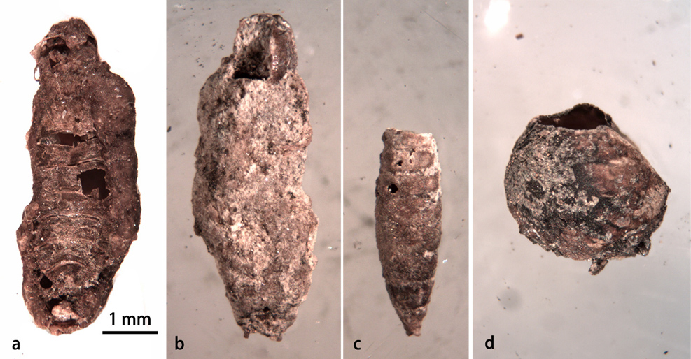 continuo ad approfittare di questo preziosissimo forum per risolvere i miei problemi di determinazione entomologica che incontro durante analisi di materiale d'interesse archeobotanico. All'interno di una cisterna di un carcere ottocentesco, che ha raccolto soprattutto liquami di latrina e frammenti di stoviglie in terracotta, ho rinvenuto, oltre a numerosi semi/frutti che danno interessanti informazioni sull'alimentazione all'interno del penitenziario (Liguria di Ponente a circa 2 km dal mare e a 20 m di quota), anche i tre reperti di cui allego una fotografia d'insieme e che, da profano quale sono in campo entomologico, mi sembrano due pupari (exuviae?) forse di Ditteri e un "ovetto" collassato a me del tutto sconosciuto (spero sarete indulgenti nel perdonarmi questa ignoranza in materia!). Le due immagini a-b riguardano uno stesso reperto (L=5,46mm): la foto "a" è stata ripresa dopo trattamento con HCl 2% che ha eliminato parte dell'involucro argilloso visibile in "b". La foto "c" ritrae un secondo reperto che mi sembra frammentato all'apice (L=3,47mm) e che non ha subito alcun trattamento, mentre la foto "d" documenta un "ovetto" collassato subsferico (L=3,17mm) con un'apertura circolare.