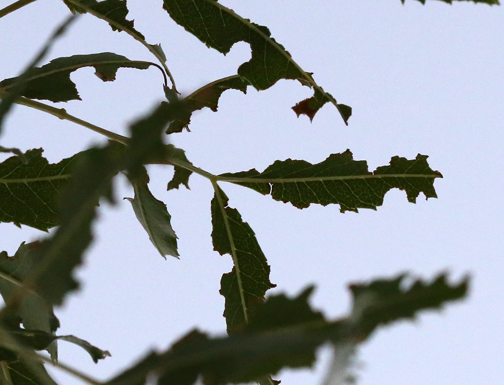 Durante una breve esplorazione di una zona arida dell'entroterra lucano non mi sarei aspettato di trovare un frassino meridionale, tuttavia isolato, dove gli altri alberi presenti sono solo impianti forestali a Pino d'aleppo. Pur non avendo notato fori di uscita dal tronco, ma non sono sicuro perchè andavo di fretta, una zona limitata della fronda si presentava con questi segni di alimentazione. Premesso che in questi giorni fa un caldo torrido, considerato che il bordo rosicchiato delle foglie non è secco ma è fresco, potreste consigliarmi a che ora del giorno (o della notte) tornarci per sorprendere gli autori mentre si alimentano? Cosa poteri trovare?