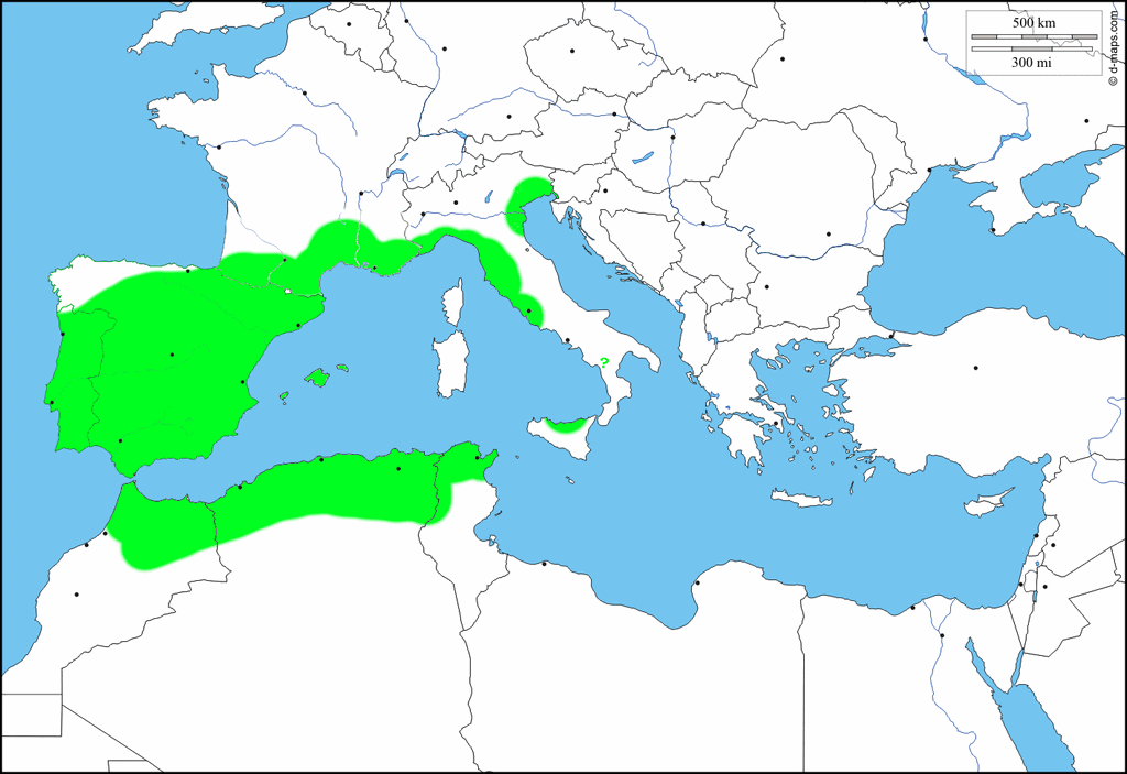 Ecco la distribuzione in Europa, un po' approssimata. Ci sarebbero da aggiungere le Canarie, che sono fuori da quella mappa.