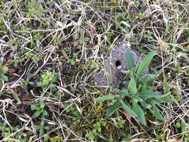 Il mucchietto di terra intorno mi fa pensare a degli apoidei, tipo Halictus, Colletes o Andrena. Di solito Sphecidae e Crabronidae puliscono intorno e allontanano la terra di risulta.