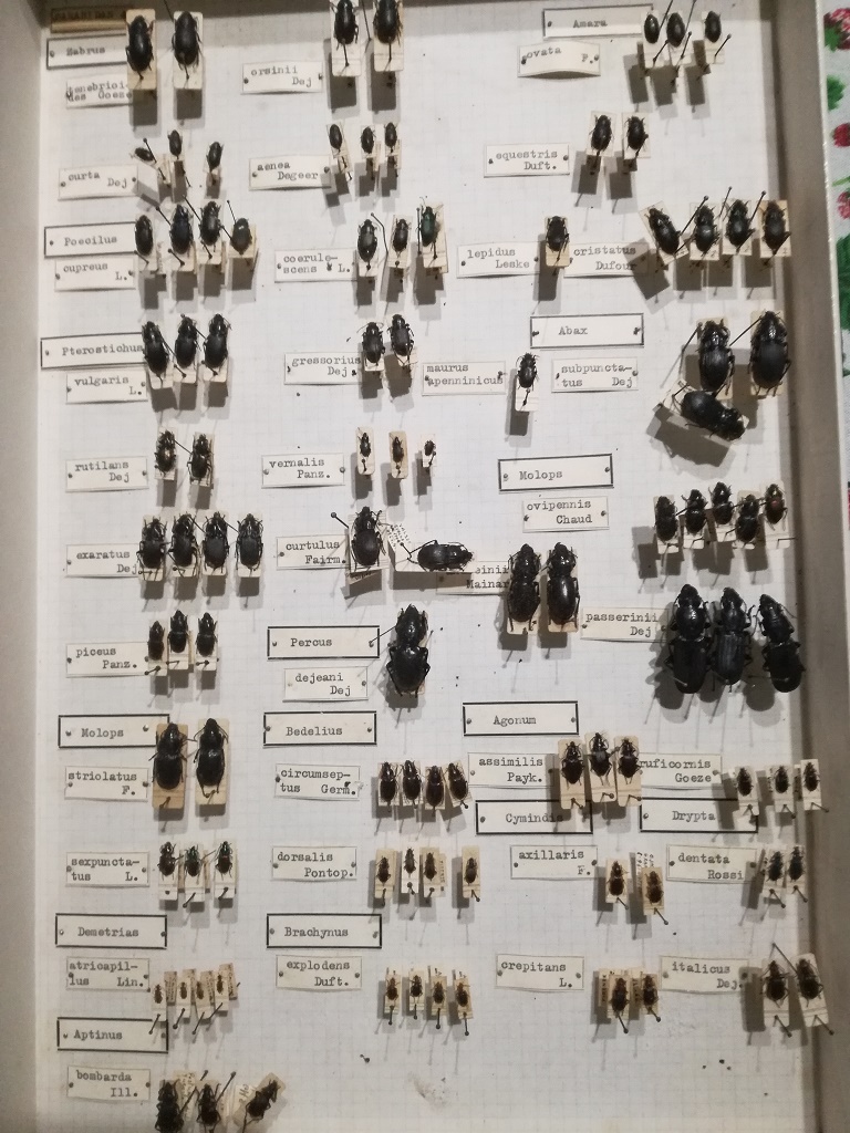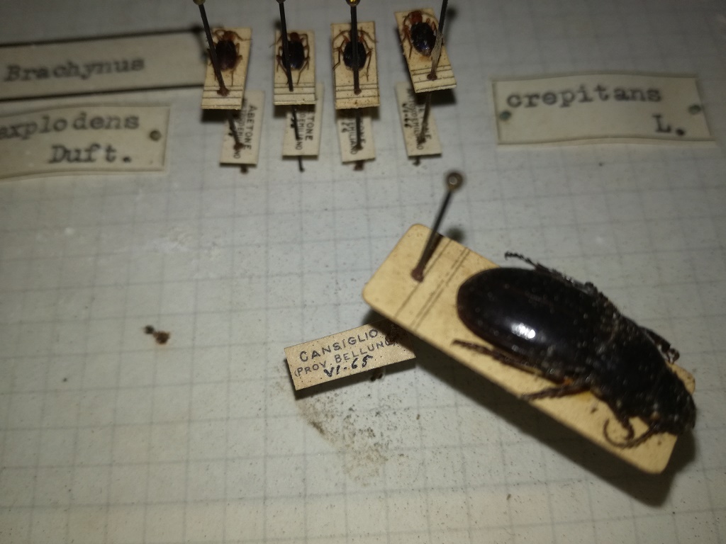 Ordunque, alcune estati fa (non ricordo di quale anno, ma probabilmente 2014) mi sono ritrovato tra le mani la cassetta entomologica che vedete in foto, rinvenuta tra un mucchio di ciarpame in un mercatino dell'usato (roba proveniente da qualche vecchia cantina svuotata, a detta della venditrice, che non mi ha saputo fornire altre informazioni). Non ho mai avuto modo di osservarla bene, dato che ho vissuto in Germania negli ultimi tre anni, quindi ho rimesso mano alle mie cose solamente da poche settimane (ovvero da quando sono rientrato in Italia). Esternamente la cassetta è molto malandata, con diversi strappi e fori di usura che purtroppo hanno dato via libera ai parassiti, anche se la stragrande maggioranza del contenuto è per fortuna intatta. All'interno vi sono esclusivamente Carabidae, tutti raccolti tra il '60 ed il '67 circa. Gli spilli sono usurati, alcuni praticamente "arrugginiti" (tant'è che faccio una fatica immane a tirar via gli esemplari dalla base, ma non credo sia ruggine, sembra piuttosto una sorta di resina solidificata, forse un prodotto di umidità e muffe, presente comunque su molti esemplari e in alcuni punti della cassetta stessa). Appiccicato ad un lato esterno della cassetta vi era un foglietto di carta scritto a mano, purtroppo andato perso, che riportava la dicitura "Bologna". Qualcuno ha una vaga idea delle origini di questa cassetta? Ho trovato il nome "Battoni" su alcuni cartellini, tuttavia gli altri che ho esaminato riportano solamente luogo e data di ritrovamento.