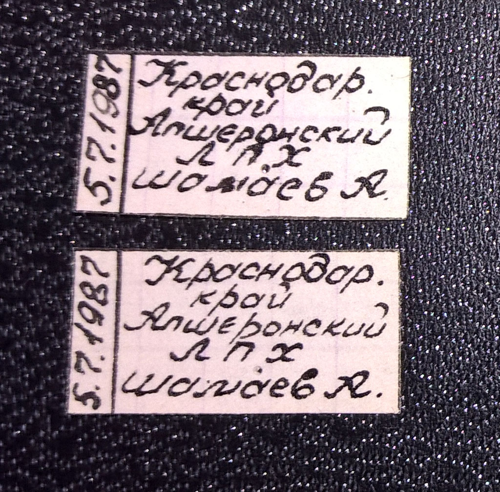 Dal poco che posso capire io il primo cartellino indica un esemplare proveniente dall'Azerbaigian prima che si staccasse dall'Unione Sovietica, i secondi due (uguali) da Krasnodar, grande città del sud della Russia, vicino al Caucaso, e i due ultimi sembra che siano delle vicinanze di Mosca stessa. Poi certamente ci sarà qualcuno che saprà entrare più in dettaglio. Saluti