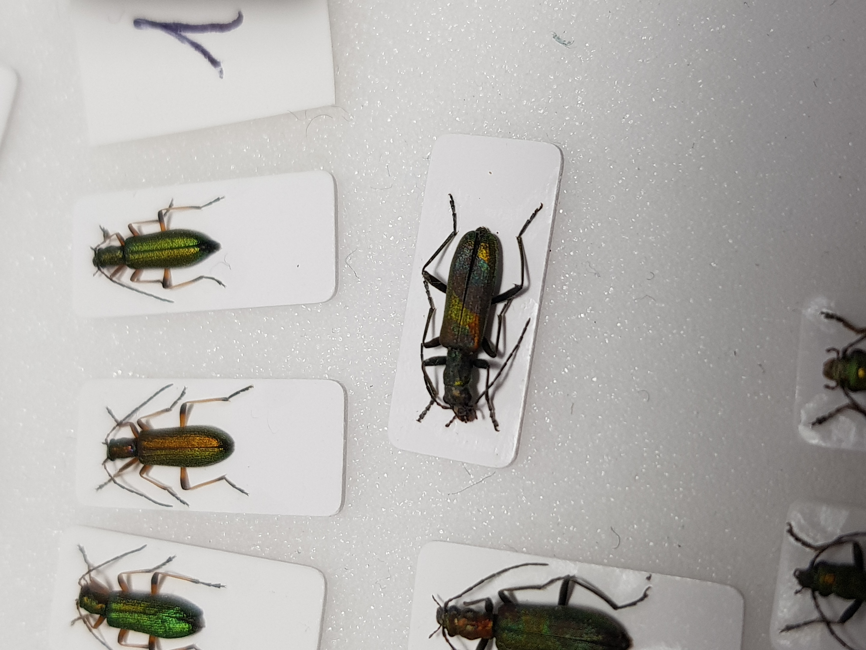 Io quando devo riammorbidire esemplari in bustina cerco sempre di metterli in camera umida dopo averli tolti dalla bustina, quando peró ci sono troppi esemplari oppure sono molto piccoli per evitare di mandarli in frantumi metto tutta la bustina dentro la camera umida con l'aceto. Succede che con esemplari di colorazione metallica verde o blu (mi capita spesso con Agapanthia del gruppo violacea e con le Chrysanthia) quando poi asciugo gli esemplari restano con iridescenze strane e colori alterati. Vi metto un paio di foto, brutte ma che rendono l'idea.