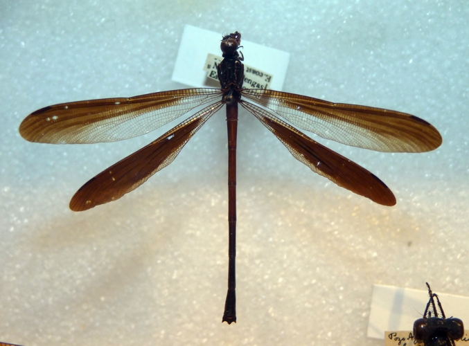 Odonato esposto in un museo di storia naturale, ma i dati scritti sulle etichette sono difficili da interpretare per me. Non riesco a leggere quello che dice, e quindi non posso conoscere l'origine della copia.