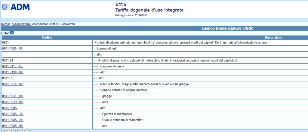Apprendo con interesse che le dogane hanno un codice preciso per la voce "sperma di tori" (cfr. seconda immagine)