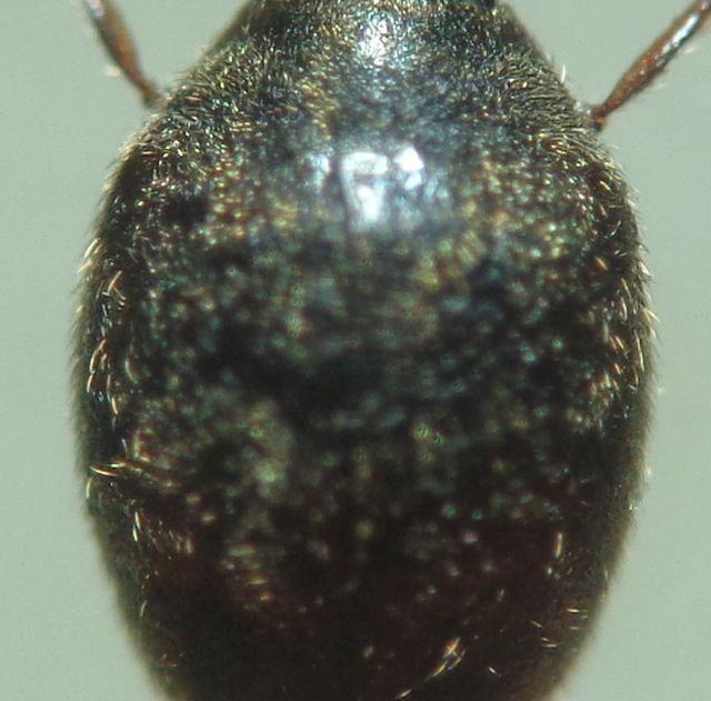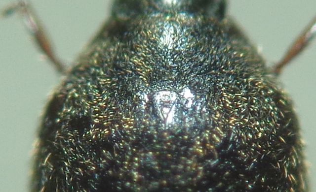 - scutello più stretto-allungato (si intravede in prima e ultima foto, anche riverificato dopo asporto della peluria), microreticolato nel terzo basale, con finissimi punti nel resto; base lineare;