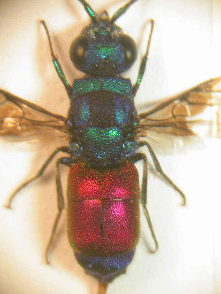 Ciao Roberto, non posso aiutarti nell'identificazione, ma visto che ultimamente sto preparando parecchi crisidi, volevo imparare come preparare al meglio le ali, ora le sto mettendo tutte a 45 gradi verso il basso, per non far sporgere l'ala dal cartellino (ah, uso quelli trasparenti). Tu invece fai fuoriuscire le ali dal cartellino? Non ti crea problemi o fastidi?