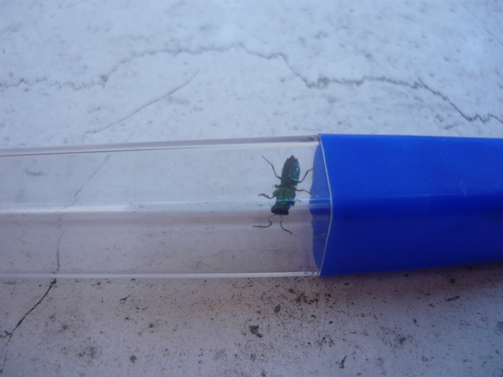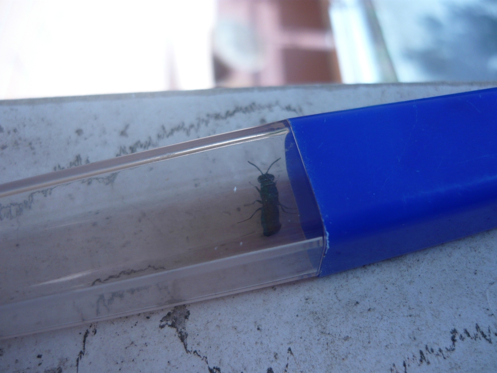 Un terrazzo metà sole e metà ombra,lui arriva e si deposita sul muretto,io sono al telefono e non posso,torno dopo un pò,insieme a lui c'è pure una vespina che gironzola.Prendo il tubetto del termometro(come sempre mai un barattolino adatto a portata di mano :devil: ),dove la sera prima era entrato un Lampiride (Lampyris noctiluca?),lo apro, aspetto che si fermi sul muretto e piano piano mi avvicino fino a uno,due cm,poi chiusura fulminea.Preso! :lol: