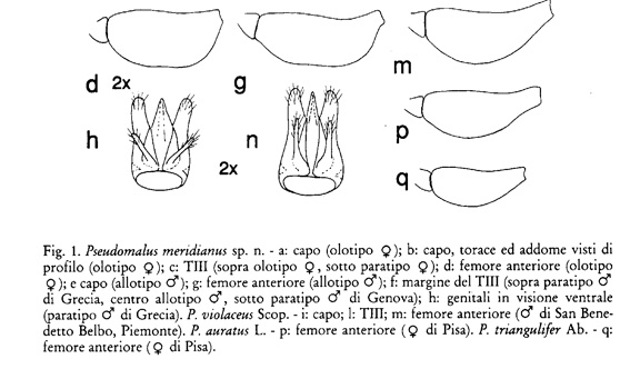 Pseudomalus meridianus si riconosce al volo per un carattere semplicissimo: la forma dei femori anteriori, che sono estesamente carenati. Il vostro esemplare ha i femori normali. Aggiungo una immagine dalla descrizione originale, che illustra molto bene questo carattere, ben presente sia nei maschi che nelle femmine.