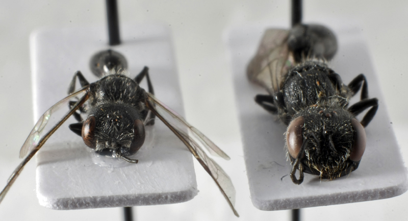 Come detto da Paolo sono due Crabronidi (una volta Sfecidi...) del genere Pemphredon. Sono, secondo me, maschio e femmina (il maschio è quello più piccolo). L'identificazione della specie basandosi su una foto non è possibile, bisogna avere gli esemplari sotto al binoculare e perderci parecchio tempo perché comunque è un genere "dificile". E' un peccato che hai preparato soltanto i crisidi e hai fatto seccare i Pemphredon :( ... a quel punto, tra l'altro avresti fatto meglio a incollarli su un cartellino triangolare, perché cosi di piatto li dettaglio del clipeo, ad esempio, non è visibile...