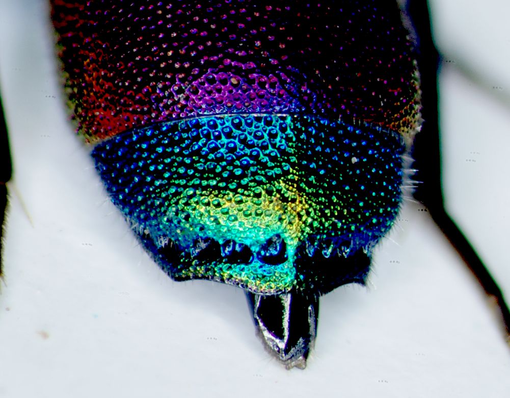 Finalmente riesco a postare qualche immagine Si tratta di una Chrysis che non conosco (una delle tante ).Assomiglia a Chrysis consanguinea ma questa ha le tegule metalliche .Ne ho catturate due esemplari, entrambi femmine. Lunghezza: circa 7 mm. |