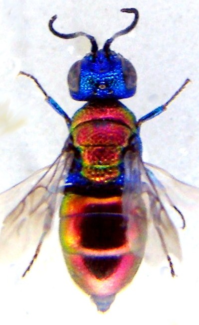 6 - usa un diffusore per la luce, per evitare tutti quei riflessi, che sui Chrysididae sono più evidenti che su ogni altro insetto (sono bestie molto difficili da fotografare bene). Per il diffusore, va bene un bicchierino di plastica senza fondo, tagliato più o meno basso secondo necessità, o un cono o cilindro di carta, o una cupoletta fatta ad esempio con la parte superiore di una bottiglia semiopaca di plastica bianca (hai presente le bottiglie di alcool denaturato o di certi detersivi liquidi?), o il supporto di plastica tronco-conico delle uova di Pasqua!