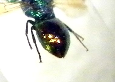 Hai provato ad usare un bicchierino di plastica, od un conetto di carta pergamena, o qualunque altra cosa per diffondere la luce? Se l'illuminazione è troppo "cruda" è difficile che le foto dei Chrysididi ti possano venire molto meglio di così, perchè fanno troppi riflessi.