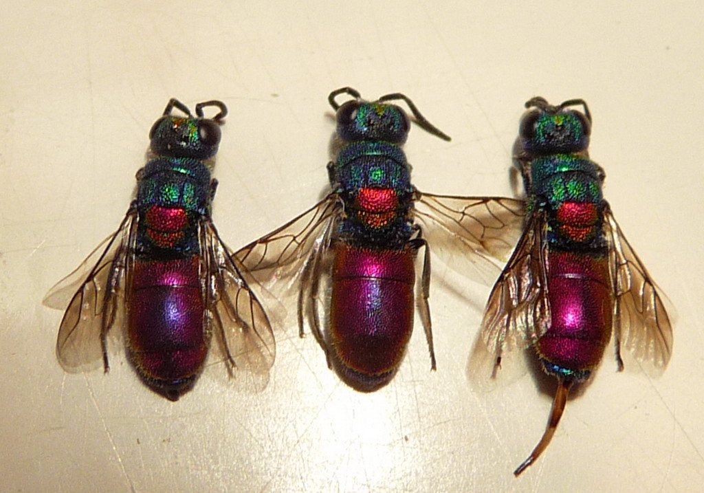 Unici tre crisidi che sono riuscito a prendere ieri (ne avevo visto un'altro, sicuramente bello, che pero non sono riuscito a prendere :( :devil: ), sulle ombrellifere nei pressi di un torrente in secca, un colpo di retino ed eccoli nel flacone :D Purtroppo mi sembrano tutti e tre la stessa specie, che per di più mi sembra di avere già: Chrysis scutellaris, giusto? La foto è pessima, ma il pattern dovrebbe essere inconfondibile.