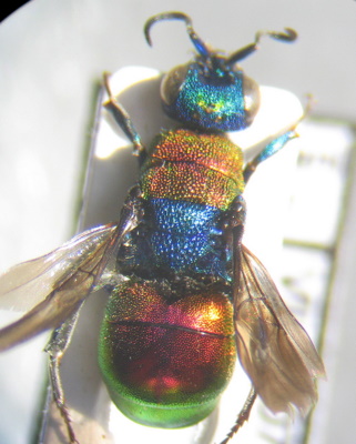 anche qui Hedychrum sp., dalle dimensioni quasi sicuramente Hedychrum nobile (Scopoli, 1763), femmina... e qui, per togliere il "quasi", mi serve una foto da sotto: attraverso il foro del cartellino, osservando un po' da davanti, si dovrebbe vedere il tubercolo mediano sul margine del 3° sternite, più grosso e ad apice intero, subtroncato (nobile) o più piccolo e ad apice profondamente inciso (Hedychrum niemelai Linsenmaier, 1959)