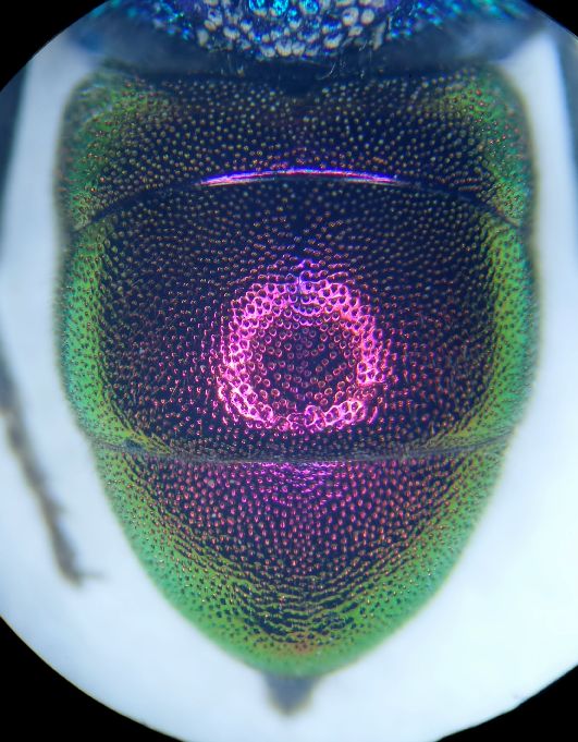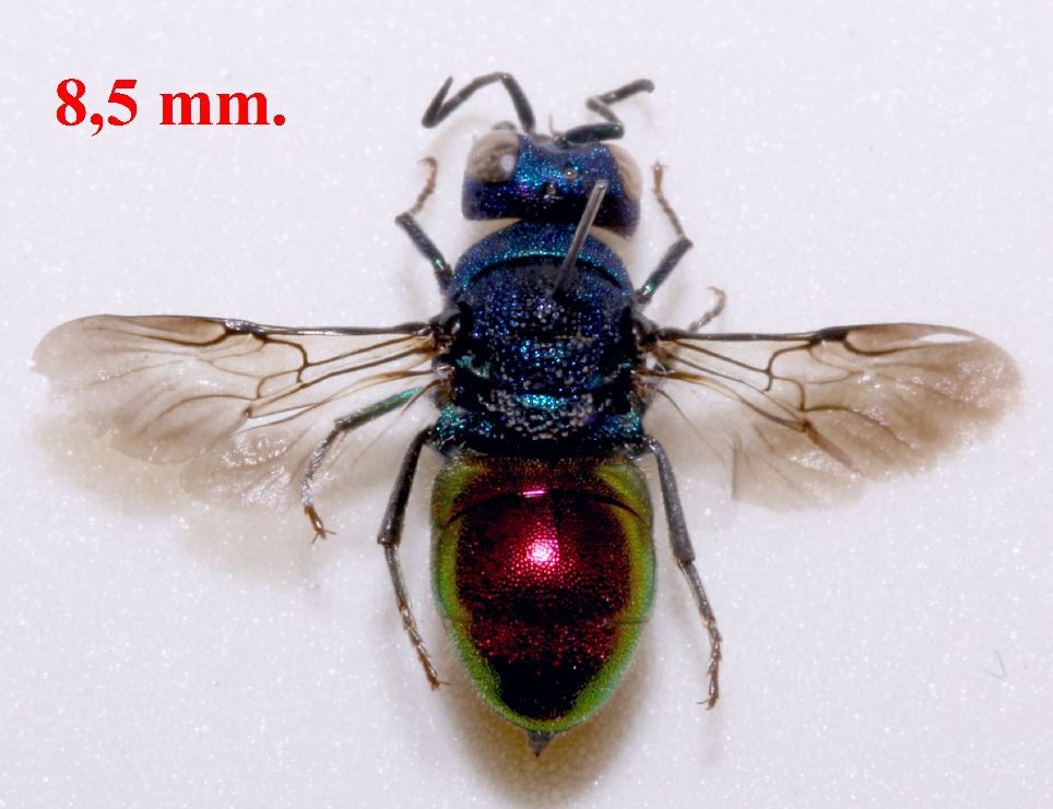 In tutte le foto sia questo che un secondo chryside della stessa specie ma leggermente più piccolo, hanno il torace e la testa decisamente verdi, ora li hanno entrambi blu.