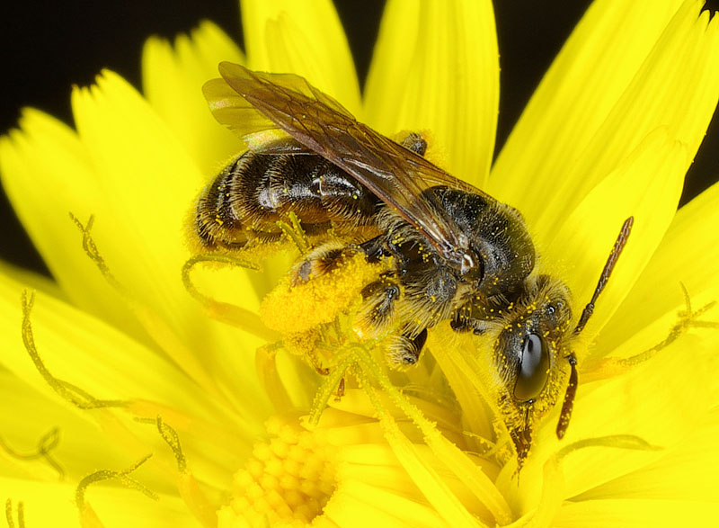 Il dato che tra le prede possano esserci anche specie di piccola taglia chiarisce tutto; ciò rende possibile l'esistenza di eventuali popolazioni "nane" di P. triangulus. Non ho idea se gli apidi che ho visto attaccati dai Philantus fossero Halictus, e purtroppo non ho foto, ma erano molto simili, se non identici, a questo esemplare, fotografato sempre in quella zona il maggio scorso. E' un Halictus?