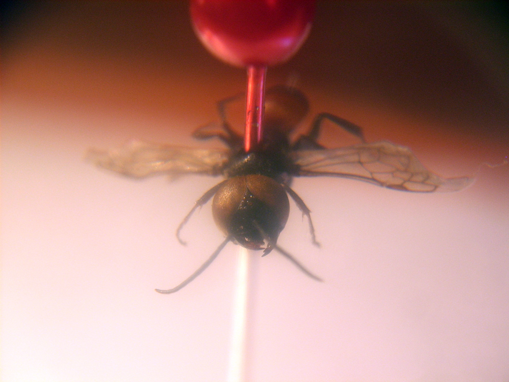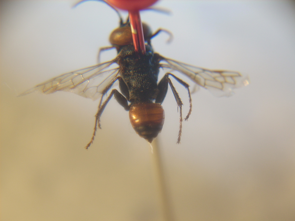 Per quanto riguarda gli spilli non credo dovrebbe essere troppo complicato (e vale senz'altro la pena) procurarsi degli spilli entomologici di dimensione appropriata (vedi ad es. il sito di "Omnes Artes" di Milano, ditta sicuramente affidabile...). Ma se proprio non riesci, allora è senz'altro meglio incollare gli insetti tipo la tua Astata su un cartellino triangolare (nella sezione "Tecniche" del forum avevo postato, circa un anno fa, una spiegazione di come si preparano gli imenotteri, che puoi prendere in considerazione, se vuoi...)...
