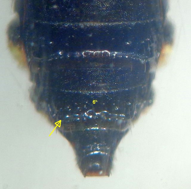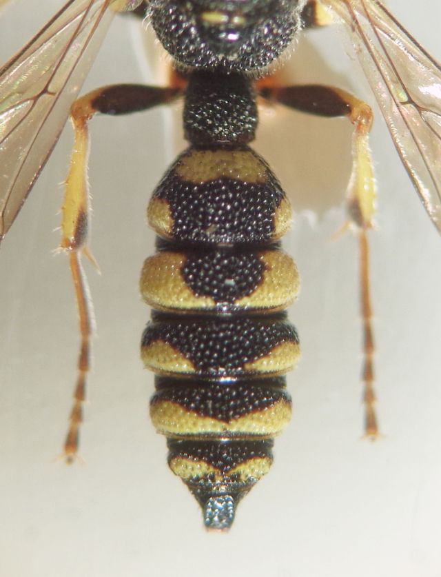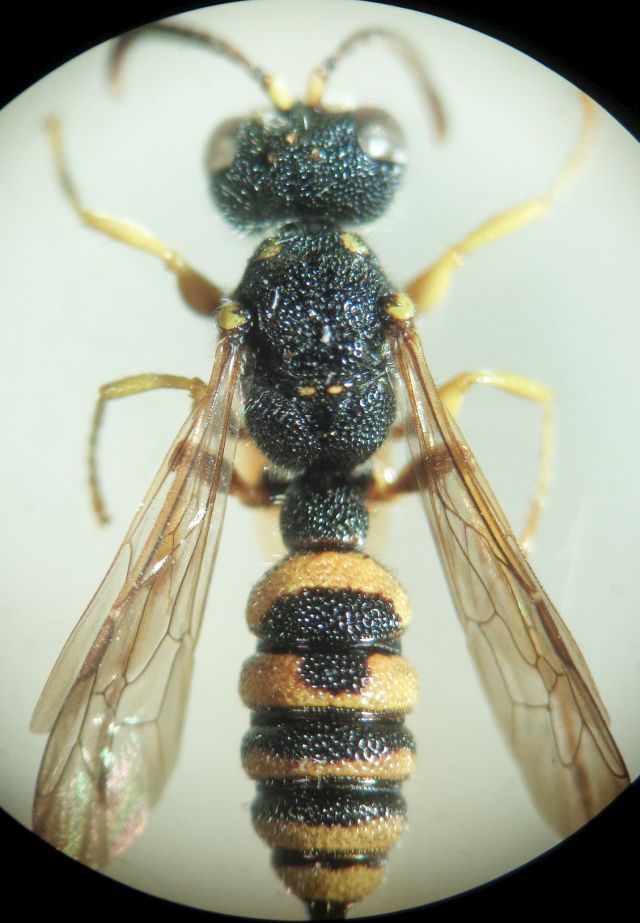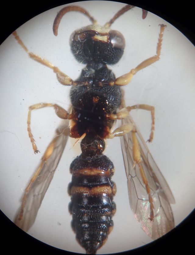 Dopo la femmina postata qui viewtopic.php?f=11&t=103366 posto un maschio di mm 9, visto che la specie era assente dal forum; di fatto mi risulta specie non comune e che è data a sud degli Appennini. Posto anche un secondo esemplare (9 mm) di Piangipane (RA), 21-VIII-2023, più oscuro, tanto che mi sembrava altro, ma ho escluso la molto simile fimbriata per la forma del sesto sternite, ad angoli posteriori arrotondati, non acuti. La specie ha una parte dorsale del propodeo lucente, con brevissime lievi strie ai margini laterali (foto).