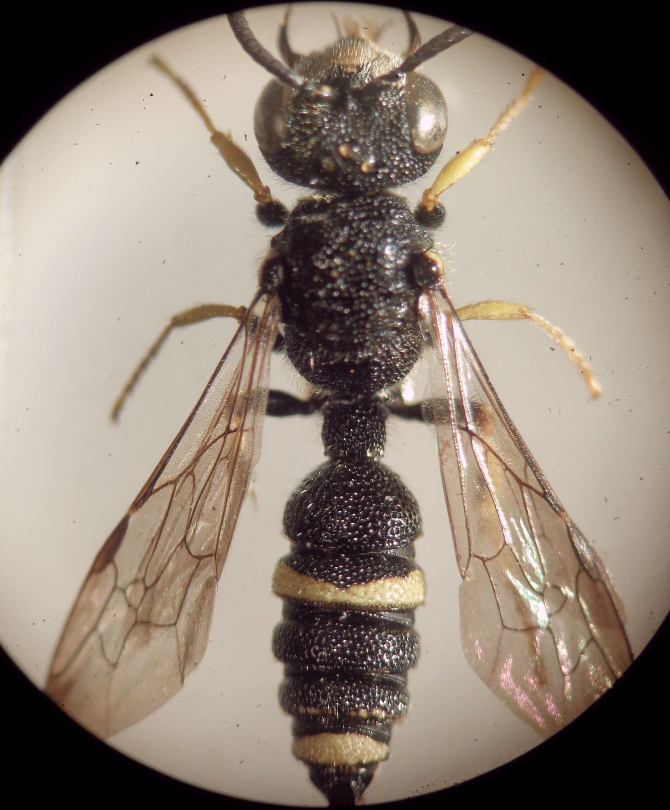 Specie non comune, avevo reperti di Civitavecchia e di Sicilia. La specie in Pagliano e Negrisolo, 2005 non è citata a nord degli Appennini, ma di Toscana e Sicilia. Il maschio (in alto) ha due punte acute al lati del VI sternum; la femmina ha il V sternum con incavo delimitato da una lamella (gr. bupresticida), diritta o con microincavo centrale. Il propodeo ha corte strie anteriormente ed il centro del disco liscio e lucido. Sembra mancare nel Forum ed anche nel web con foto scarse e poco dettagliate. mm 9. Leg. L. Colacurcio.