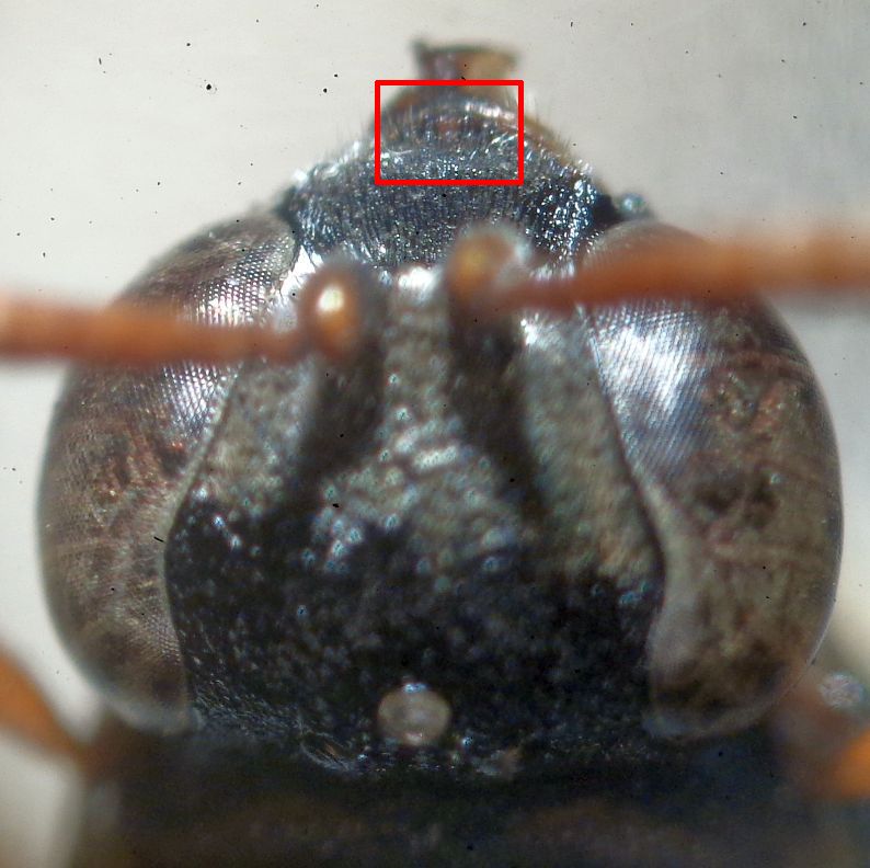 Molto poco rappresentati nel web, i Nysson non sono abbondanti e talora difficili da identificare, anche per la variabilità di colorazione nei sessi e nella specie; questa femmina di mm 7 si caratterizza tra l'altro per i due acuti dentini apicali del clipeo (riquadro rosso). Inoltre ha il 1° sternum con due carene molto ravvicinate; i denti propodeali sono robusti e appuntiti.