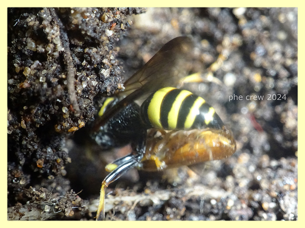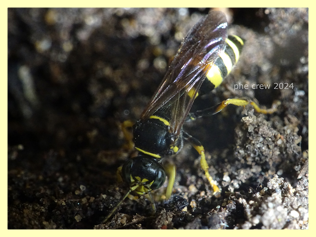 ...ogni tanto, quando non ho niente da fare, mi metto ad osservare gli Imenotteri scavatori che gironzolano tra piante e vasi. Seguendo due chiavi diverse arrivo, per questo Crabronidae, a una femmina di Gorytes laticinctus. Una specie comune, ma che non avevo mai avuto tempo di fotografare. L' ho osservata mentre portava le sue prede nel cunicolo che aveva scavato nel terreno. Per ogni preda portata riapriva l' entrata precedentemente chiusa con un po di terra. I suoi viaggi variavano dai 10 ai 20 min. fino ad arrivare anche ai 30 min.