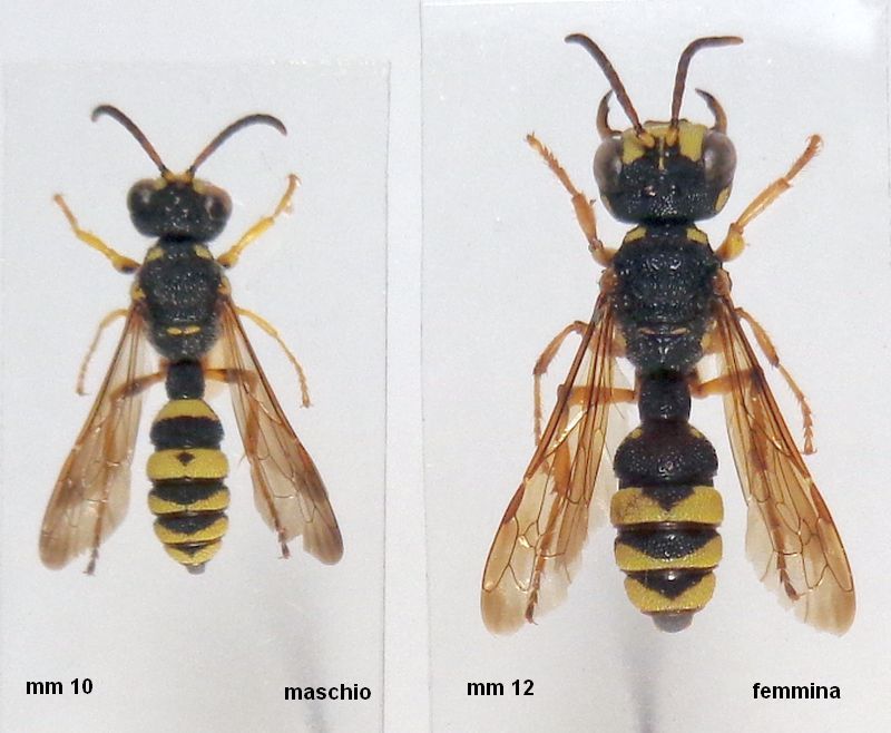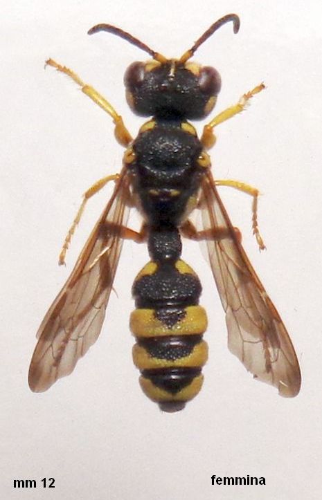 La specie, è peculiare anche per la carena interantennale (freccia) che si prolunga sin sotto l'ocello anteriore, in entrambi i sessi; le femmine hanno il clipeo un po' incavato, convesso nei maschi. Le due femmine hanno diversa estensione delle macchie ai lati del 2° tergite. Femmina con area pigidiale opaca e finemente microsculturata, nel maschio essa è lucida tra grossissimi radi punti.