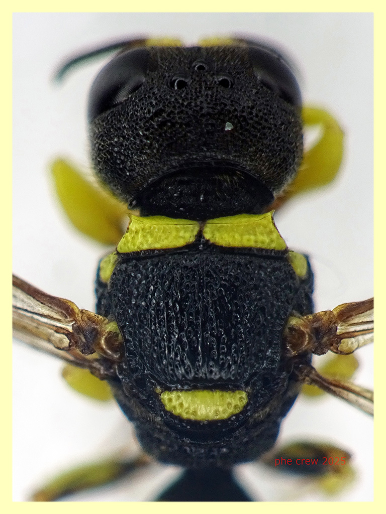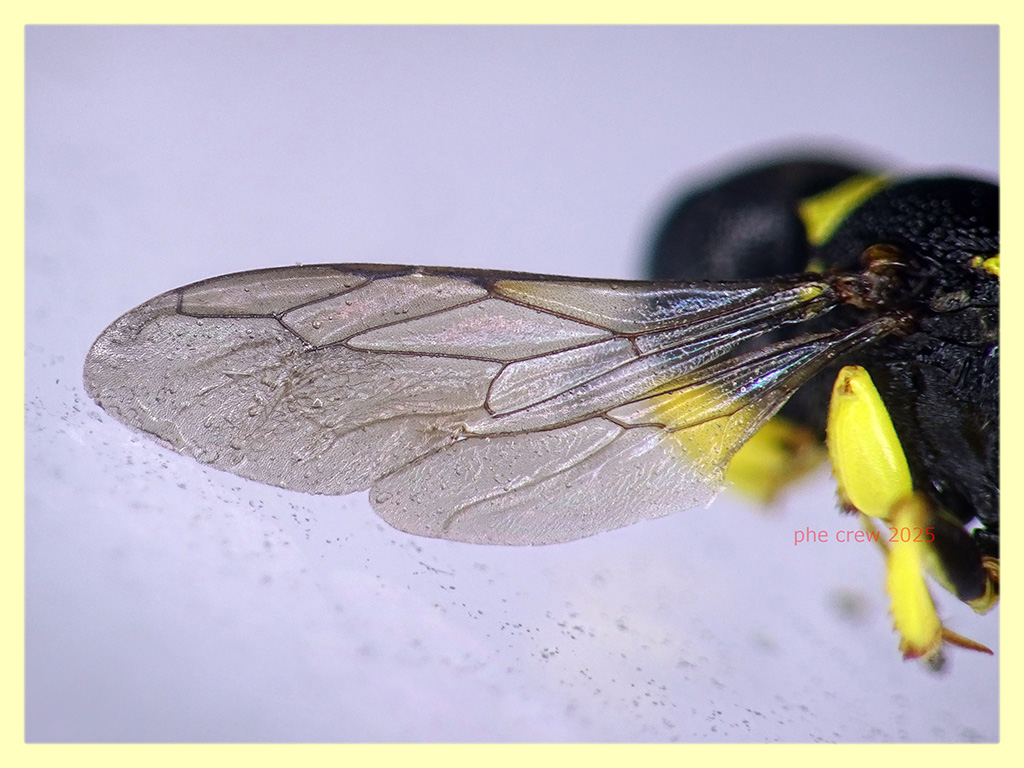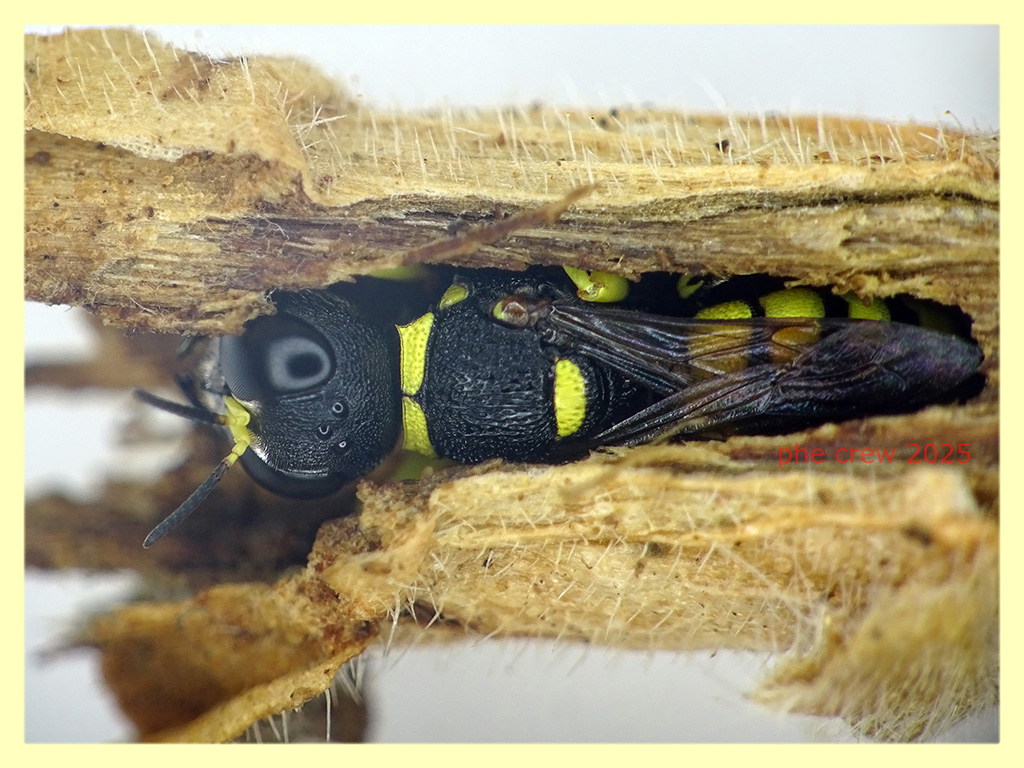 ....invece guardando bene le foto al pc sembra proprio un Ectemnius sp. . E' sopravvissuto con acqua e miele dal 31 Agosto fino al 2 Ottobre 2025 ...ben 32 giorni !....ma poteva campare di piu', perche' e' perito per mia causa. Lo alimentavo con acqua e miele e poi lo lasciavo un po di tempo al sole....e lui si crogiolava pulendosi faccia, zampe, ali.....quando arrivo' il fatidico 2 Ottobre ...come da prassi lo lascio al sole.....ma me ne dimentico....dopo 5-6 minuti ritorno e lo trovo stecchito ! :( . A proposito quanto e' longevo in media un Imenottero di questo genere ?