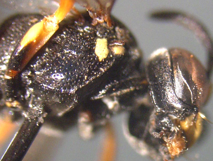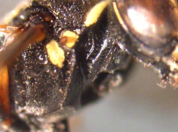 Rivedendo l'insetto con le dritte di Maurizio é molto verosimile che si tratti del maschio di Hoplisoides punctuosus, difficile fotografare la metapleura, stavolta l'ho fatto con una compatta sull'oculare del microscopio. L'omaulus e lo sternaulus mi sembrano presenti ma non ho idea della carena acetabolare, é forse quella ortogonale al passaggio tra omaulus e sternaulus (ammesso che abbia interpretato correttamente l'anatomia)? In tal caso la diagnosi dovrebbe essere certa.