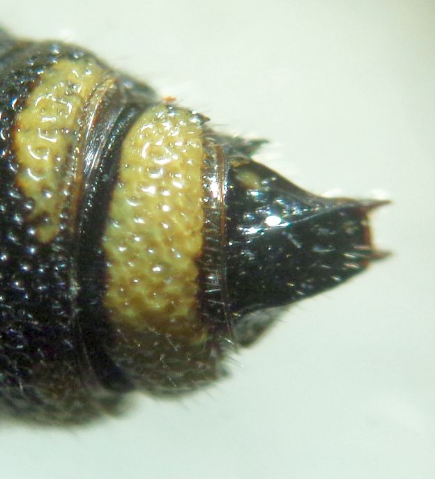 La specie non è documentata in dettaglio nel Forum quindi posto questo maschio preso a casa mia sulla solita Ferulago campestris, immersa in una nuvola di piccoli imenotteri e sirfidi; le foto mostrano in particolare i denti presenti all'angolo esterno apicale del 6 sternite e quello più piccolo all'angolo apicale esterno del corrispondente tergite. Mi chiedo cosa prederà la femmina in un ambiente poverissimo di buprestidi: il fiume non è lontano ove potrebbe trovare qualche Coraebus rubi e non so che altri. mm 10.