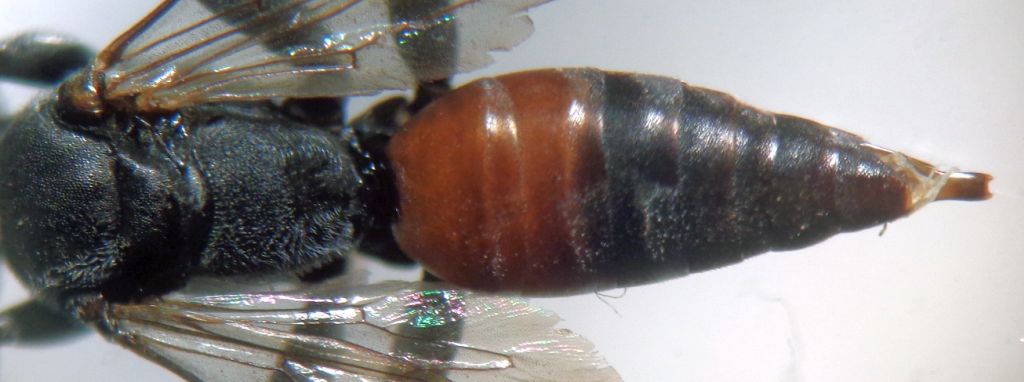 Specie non particolarmente difficile da identificare anche coi soli caratteri esteriori, ma ho voluto conferme dalle parti edeagiche. mm 8,5. M. Pavesi leg. Se si usano le chiavi di Pagliano nel suo volume sulla Fauna d'Italia, il punto più critico è sempre il punto 8 ove si debbono valutare aspetto di mesopleure e lati del propodeo; nel dubbio si devono tentare i due percorsi. In ogni caso tutte le specie (i maschi) sono abbinate alle rispettive strutture edeagiche che sciolgono parecchi dubbi. In questo caso la volsella ha lobo superiore largo e basso, a fronte di una parte terminale molto esile sin dalla parte iniziale. L'edeago presenta 3-4 dentelli per ramo, ben visibili. Clipeo con lamella triangolare, ultimo sternite normale, a due punte.