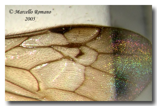 Per confermarlo, ovviamente, è necessario esaminare l’esemplare, ma mi convincono già in tal senso una serie di caratteri visibili e, soprattutto, se vedo bene, la forma caratteristica della seconda nervatura trasverso cubitale che non raggiunge la cubitale, ed è ingrossata e piegata all'apice in modo da formare una specie di T irregolare rovescita. Meglio di qualunque descrizione, vale l'immagine dell'ala di S. ausonia che ti metto per confronto.