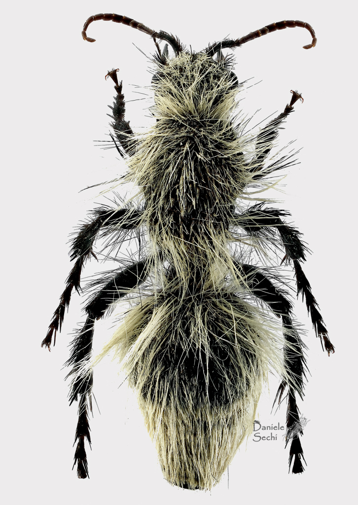 Si, è lei L'unica specie con la quale potrebbe, a prima vista, confondersi, è la Dasymutilla gloriosa (Saussure, 1868) (vedi questa immagine). Ma in D. gloriosa il tegumento è rossiccio e la lunga peluria bianca ricopre tutte le zampe ed il corpo, anche ventralmente. In D. sackenii invece il tegumento è interamente nero e la pubescenza bianca non è presente nella parte sternale e sulle zampe che sono ricoperte da setole nere. Qui puoi vedere tutta una serie di immagini di D. sackenii (maschio e femmina), compresa questa che ne mostra la parte sternale. |