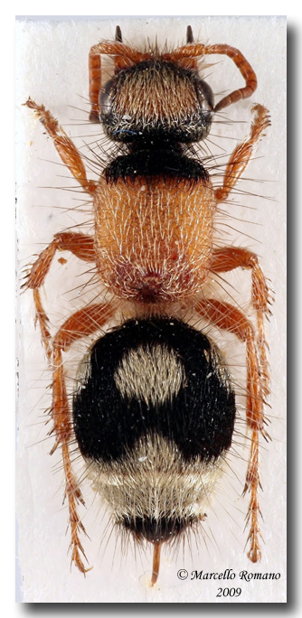 Fra i caratteri più evidenti, che rendono questa specie immediatamente riconoscibile, ricordo la macchia di pubescenza aderente argentea molto densa, presente sul vertice ed estesa fino al margine interno degli occhi con il tegumento sottostante di colore rosso; il margine anteriore del mesosoma con un'ampia fascia di pubescenza nera; l'unguicolo scutellare molto evidente, largo e trasversale, fortemente rilevato a squama in tutta la sua larghezza e ombreggiato lungo l'orlo superiore. Sul secondo tergite sono presenti tre macchie ben marcate di pubescenza argentea.