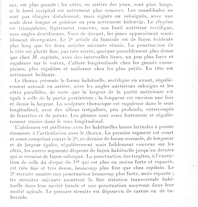 Si differenzia nettamente da M. calva per la mancanza di "alette" ricurve alla base dell'addome, per la forma delle mandibole, clipeo, ecc.