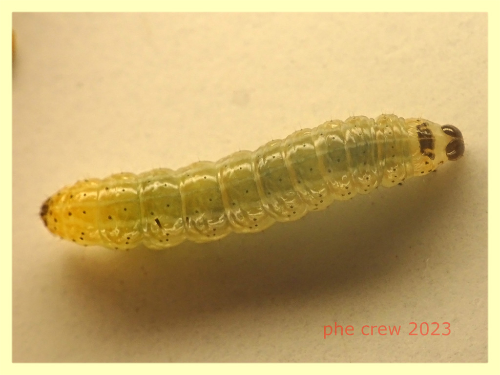 ...dato che questa era gia' cresciutella, manca dunque la foto della larva negli stadi precedenti che ho fotografato in un altro bocciolo (inizialmente sembrava un Tortricidae...poi crescendo)...eccola qui: