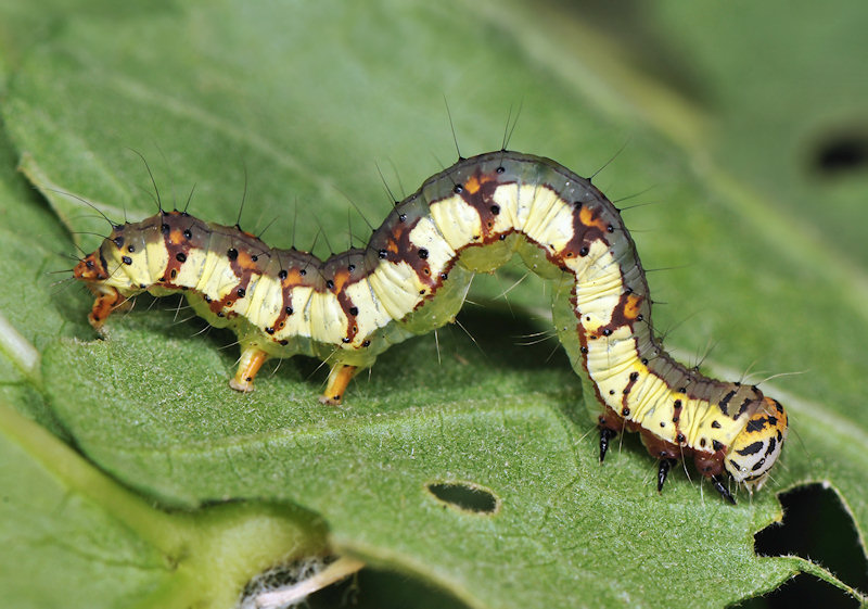 Incuriosito dall'apparizione di bruchi di questa specie su più forum ;) e non avendola mai vista, negli ultimi due giorni, approfittando della pausa pranzo, sono andato a cercarla, prima sul litorale tra Fiumicino e Fregene, poi (ieri) anche lontano dal mare, nella zona tra Malagrotta e Ponte Galeria, in pratacci degradati a bordo strada asfaltata. Risultato: se avessi voluto avrei potuto prenderne cinquanta, di bruchi, è comunissima sulle malve soprattutto in posti caldi e secchi, e i bruchi sono ben visibili sopra le foglie e attivi anche nelle ore centrali della giornata, insieme a larve di Acontia lucida (Hufnagel, 1767), Autographa gamma (Linnaeus, 1758), Vanessa cardui (Linnaeus, 1758) e Carcharodus alceae (Esper, [1780]). E si presentano in due forme totalmente diverse tanto da apparire come due specie distinte, che all'inizio ritenevo una giovane (verde) e l'atra matura (colorata), ma le dimensioni sono le stesse, ritengo quindi che siano due forme alternative, quella verde nettamente preponderante (a spanne 10:1):