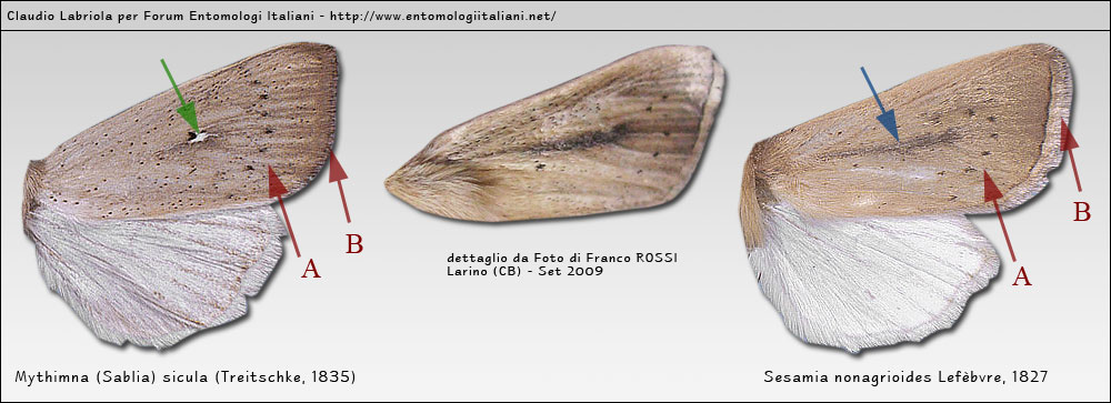 Inoltre in M. sicula è sempre presente il punto chiaro (freccia verde) e meno frequente la linea scura longitudinale al centro (freccia blu) che è invece presente in S. nonagrioides.