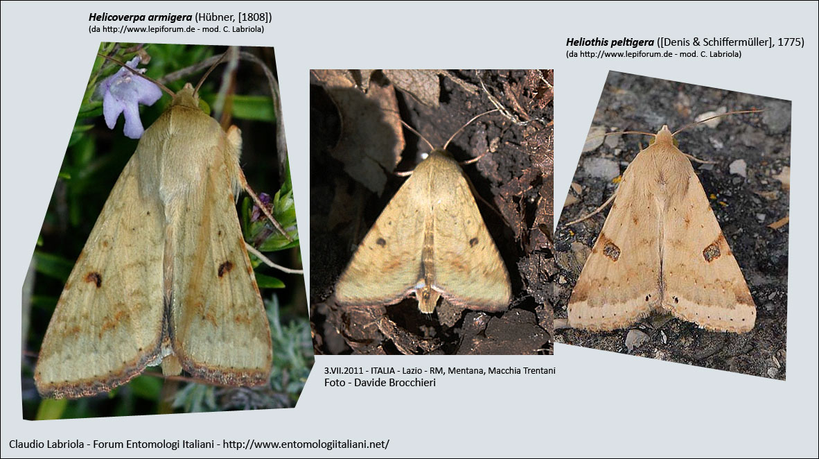Tornando alla foto "sfocata" :D di Davide io resto convinto con buona approssimazione che si tratti di Helicoverpa armigera (Hübner, [1808]). Di seguito inserisco un confronto fatto velocemente che mostra una H. armigera e una H. peltigera (foto prese da lepiforum.de) con l'esemplare fotografato da Davide (al centro). Ho solo corretto un po' le curve per rendere più visibile il pattern ...