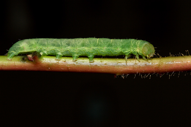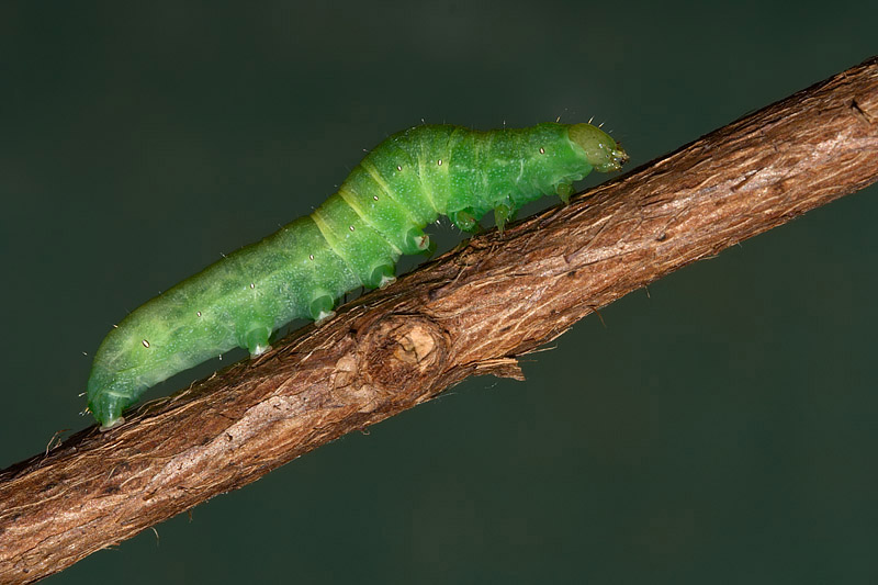 Non ci sono molte foto della larva sul web, ne ho viste solo alcune su lepiforum.de, sembra un po' diversa, la mia ha mantenuto la colorazione verde fino alla fine :)